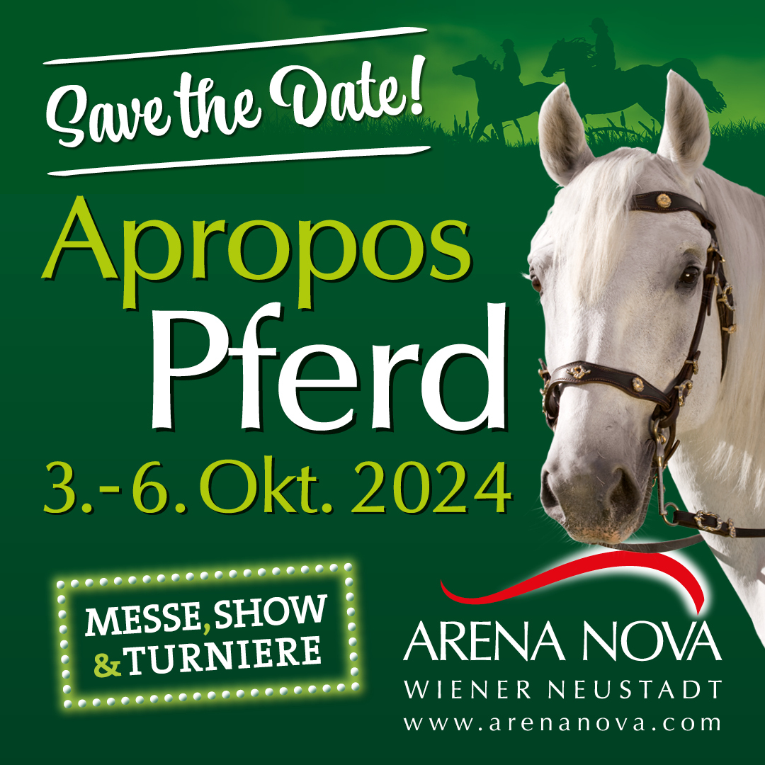 Für viele Menschen ist sie das Jahres-Highlight der österreichischen Reitsportszene – die Apropos Pferd in der Arena Nova! Die Vorfreude ist groß, wenn die Messe auch in diesem Jahr wieder von 03. - 06.10. ihre Pforten öffnet. Als eine der größten Pferdemessen in Österreich ist die Apropos Pferd durch ihr vielfältiges Programm, wo Spitzensport und Freizeitreiten aufeinandertreffen, seit nunmehr 30 Jahren sehr beliebt.